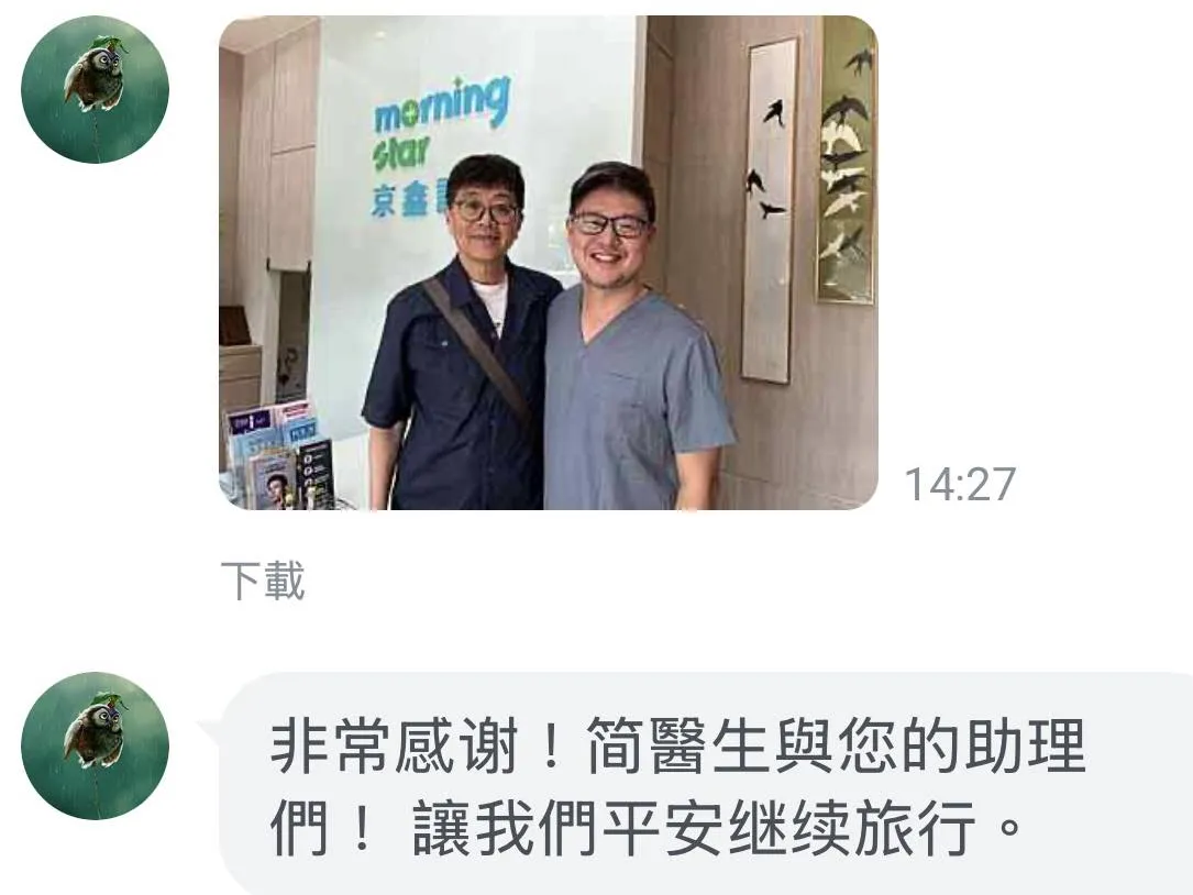 病人沒多久後就搭著計程車前來,在簡醫師的協助下,順利的解決了病人的問題,離開前,這位旅客非常的開心希望跟簡醫師一起拍張照, 京鑫祝您接下來的旅程一切平安順利,帶著太太 往下一個目的地邁進